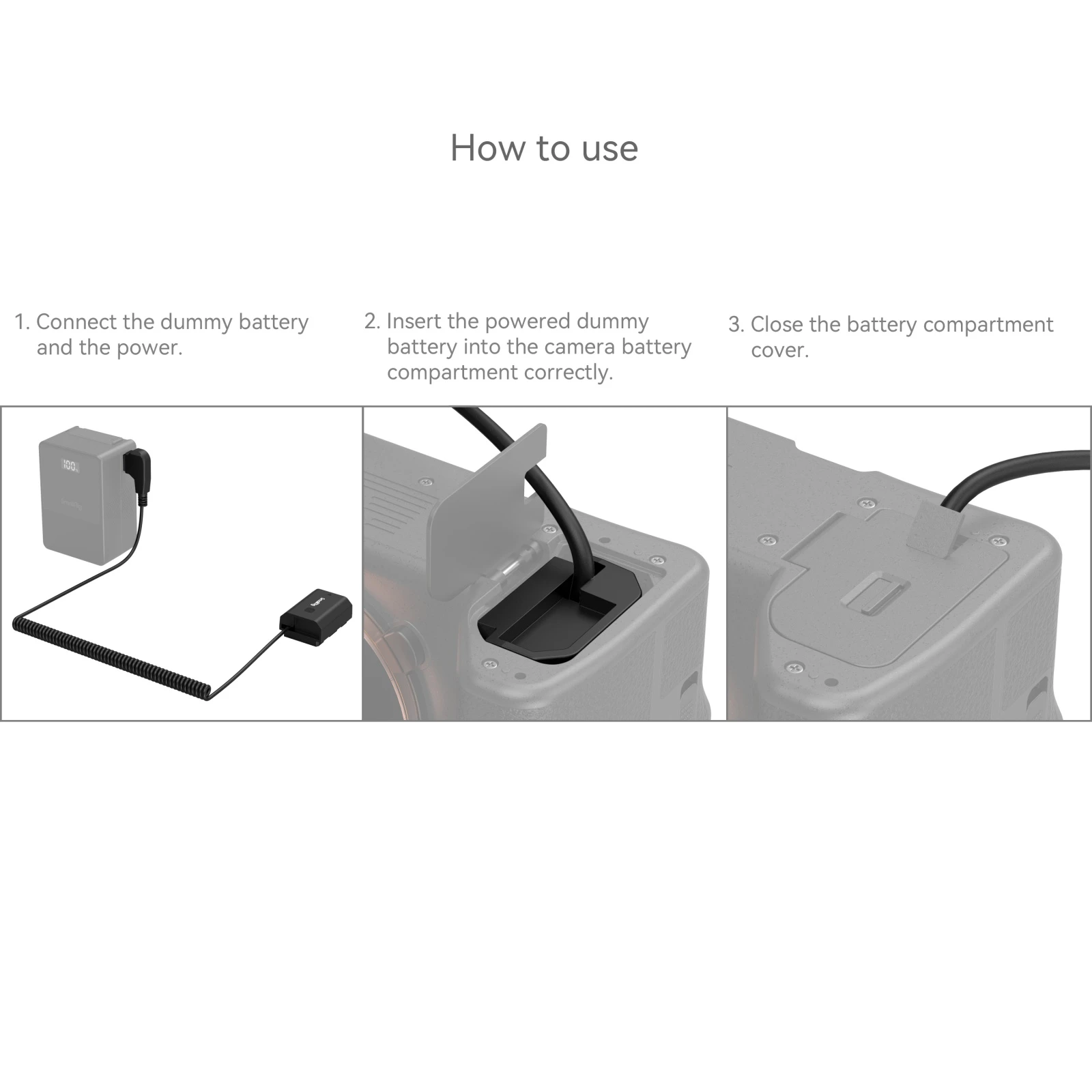 ·Cómo usar: ①Conecta la batería dummy a la batería V mount; ②Inserta la batería dummy alimentada en el compartimento de la cámara correctamente; ③Cierra la tapa del compartimento de la batería. Sigue los pasos de instalación al usar. Si el compartimento de la batería no está cerrado, la batería dummy no funcionará correctamente.